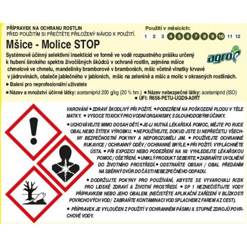 AGRO Mšice - Molice STOP je velmi účinný insekticid, který působí na všechna vývojová stadia škůdců. Velmi účinně působí na hmyz jako je mandelinka, mšice, molice, obaleč atd.