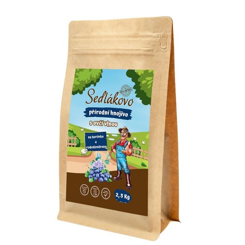 Sedlákovo přírodní ekologické hnojivo na borůvky a rododendrony s ovčí vlnou je nejkomplexnějším organickým hnojivem. Hnojivo s ovčí vlnou je určeno pro venkovní pěstování kyselomilných rostlin, zejména borůvky, muchovníky, azalky a rododendrony. Sedlákovo hnojivo zlepšuje vlastnosti půdy a obohacuje ji o živiny. Obsahuje peletovanou ovčí vlnu s přírodním uhlíkem a humáty, sedlákovu rohovinu, fermentovaný sedlákův kravský a slepičí hnůj, kostní moučku obohacenou o kakaové mušle a další organická hnojiva. Toto hnojivo funguje jako aktivátor růstu, podporuje tvorbu mikroflóry v půdě, dodává potřebné živiny, fulvové a huminové kyseliny a v neposlední řadě provzdušňuje půdu. Sedlákovo hnojivo také stimuluje biologický život v půdě. Svými vlastnostmi výrazně pomáhá absorbovat a také zadržovat vodu v půdě. Díky obsaženým biostimulačním látkám pomáhá rostlinám k vitalitě a zdravému růstu, zvyšuje jejich obranyschopnost a lepšímu zvládání abiotických stresů. Díky obsažené ovčí vlně a rohovině má dlouhodobý efekt a hnojivý účinek. Příznivě působí na vývoj kořenů a celkovou kondici rostlin. Zabraňuje degradaci půdy.